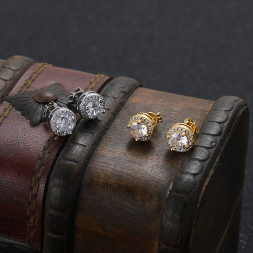 Western Hip-Hop Round Stud Earrings - Copper with Full Zircon Inlay, Cubic Zirconia Earrings, Unisex Statement Couples Jewelry, 2nd Anniversary Edition, Sparkling Crystal Trendy Hip-Hop Earrings
